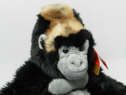 Este peluche es un gorila de edad adulta, lo sabemos porque su espalda es de color plateado y esta tonalidad la alcazan a partir de los 10 años, los gorilas jóvenes suelen tener toda la espalda de color negro. Su cabeza es de color marrón, y todo el resto del cuerpo salvo sus manitas y pies es de pelo color negro muy brillante. Es un peluche con todos los detalles, está hecho a mano con materiales de gran calidad y lo podrás lavar a mano cuando llegue a casa sucio después de pasar mil aventuras junto los niños.